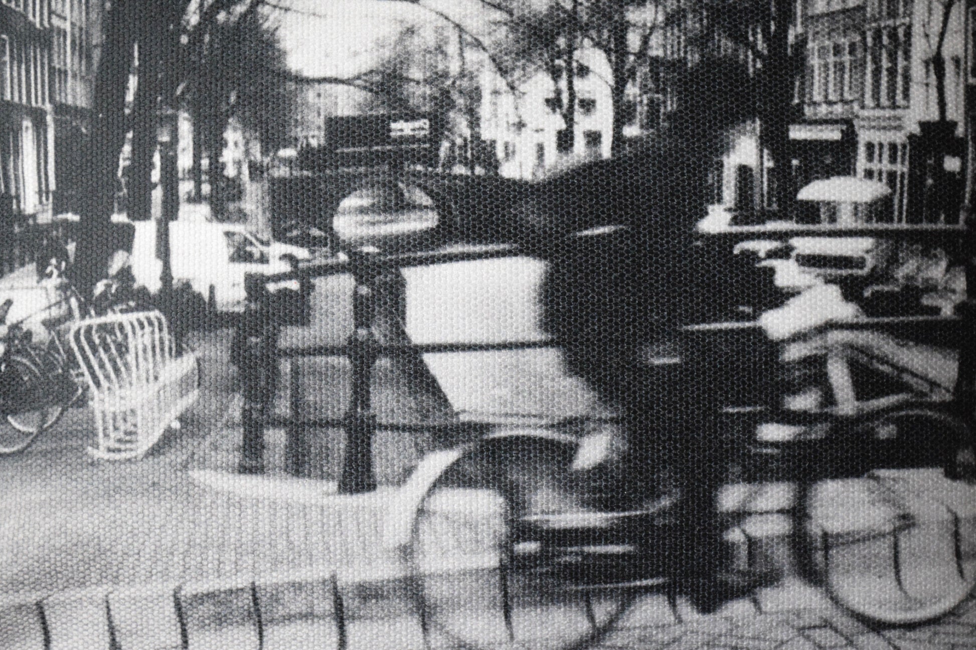 • Printed with a one of a kind, Amsterdam Biker in B&W image on one side, neutral color on the other