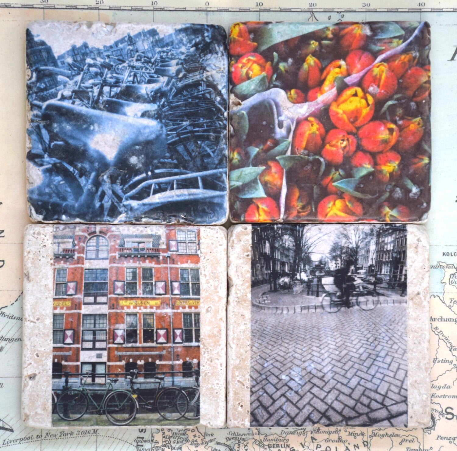 Amsterdam Stone Coasters, beautifully photographed, featuring Amsterdam's unique architecture, bicycles and tulips.