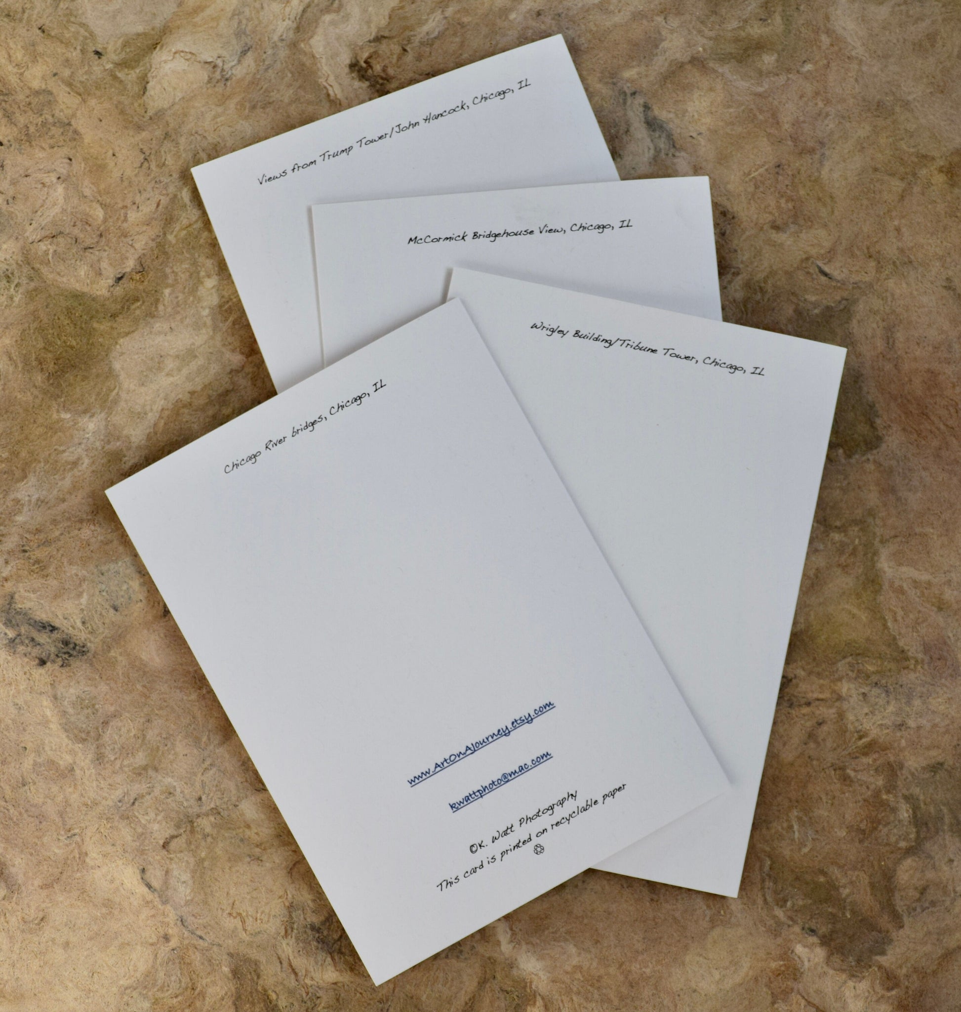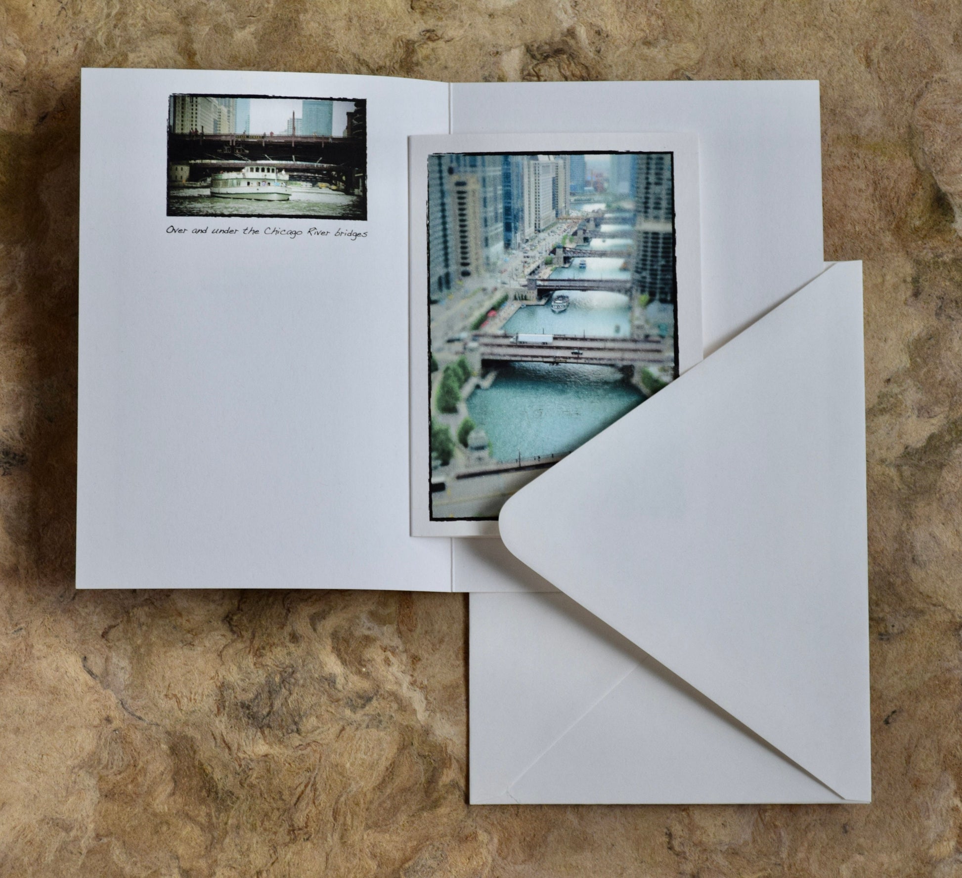 • Unique to my Chicago Cards are that I also have a small inset photograph that corresponds to the cover shot, with a short phrase. The rest is Blank with plenty of space for your correspondence.