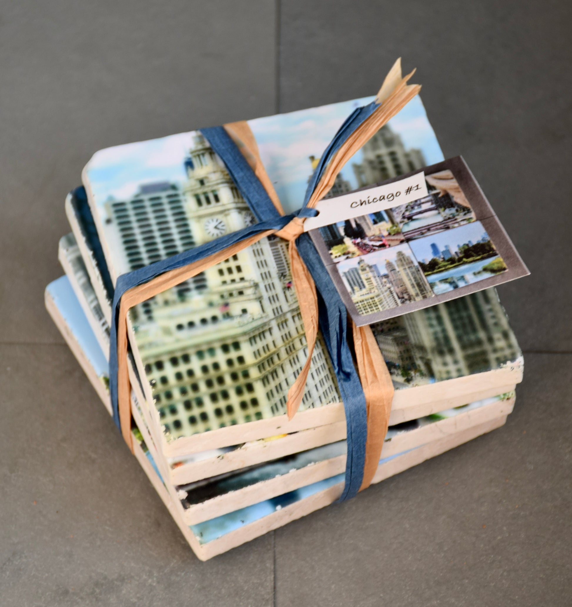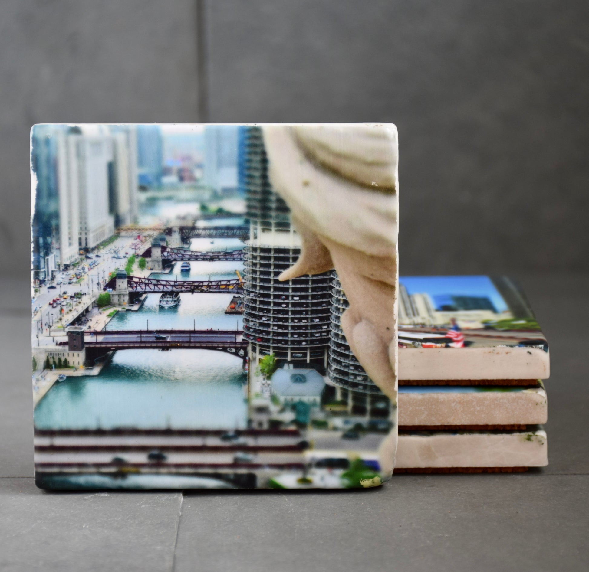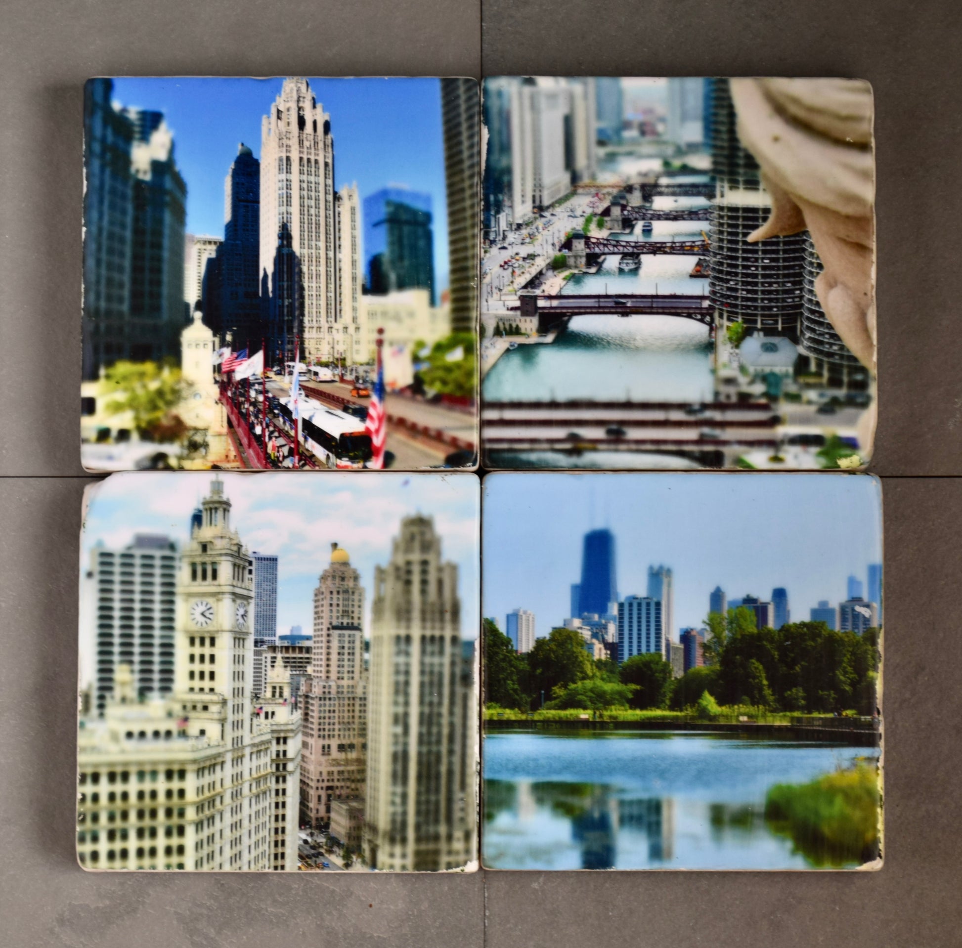 • Each Chicago Stone Coaster set features 4 different images from Chicago, including; views down the Chicago River, the Tribune Tower and the Wrigley Building, along with a cityscape from Lincoln Park Zoo.