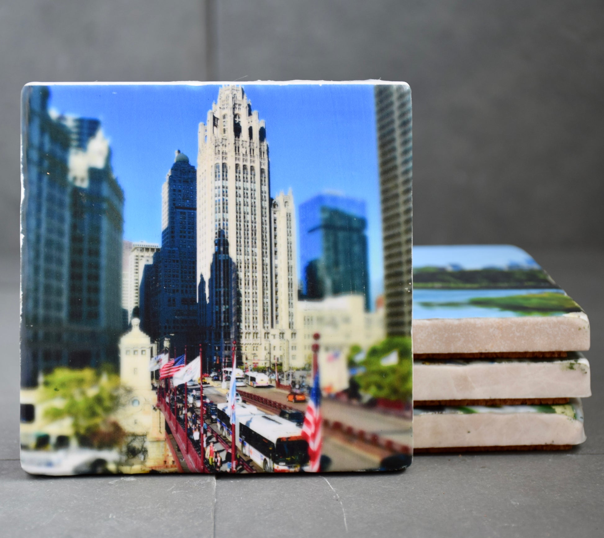 Rest your beverage on a bit of Chicago with these Chicago Stone Coasters, featuring beautiful, ArtOnAJourney photographs of iconic views in Chicago.