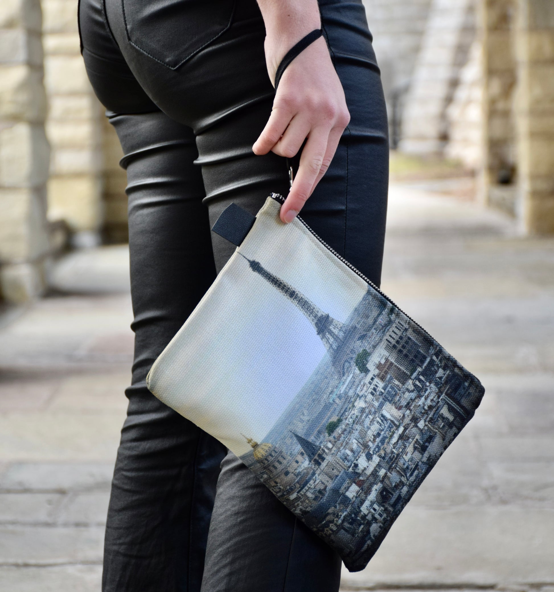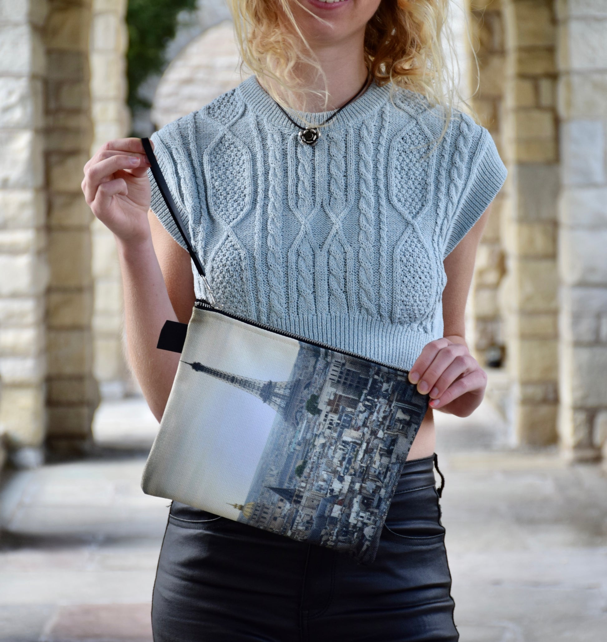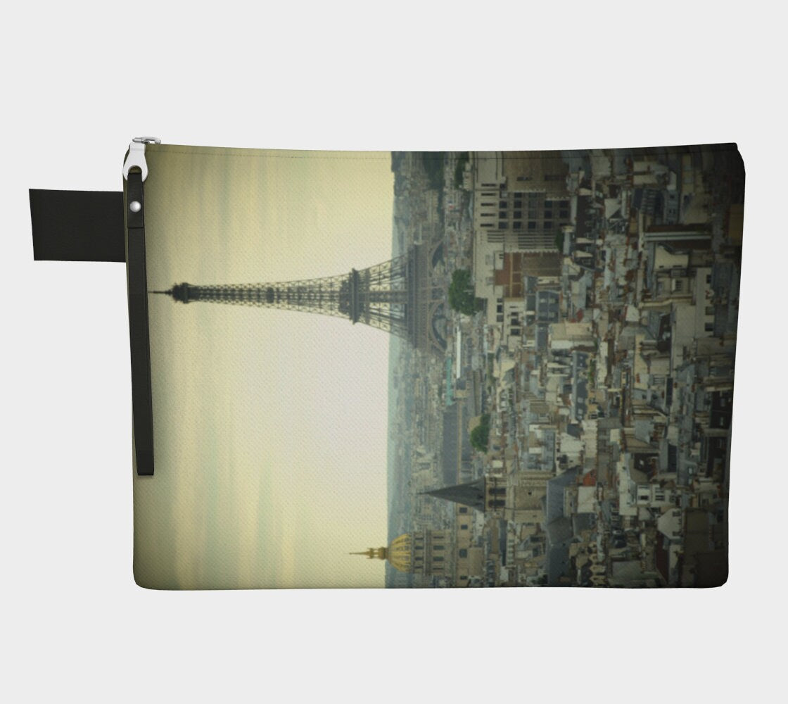• Your Paris Wristlet Bag is beautifully, custom printed with a ArtOnAJourney photograph of the Eiffel Tower from the towers of the Notre Dame, using a filter to enhance this historic city.