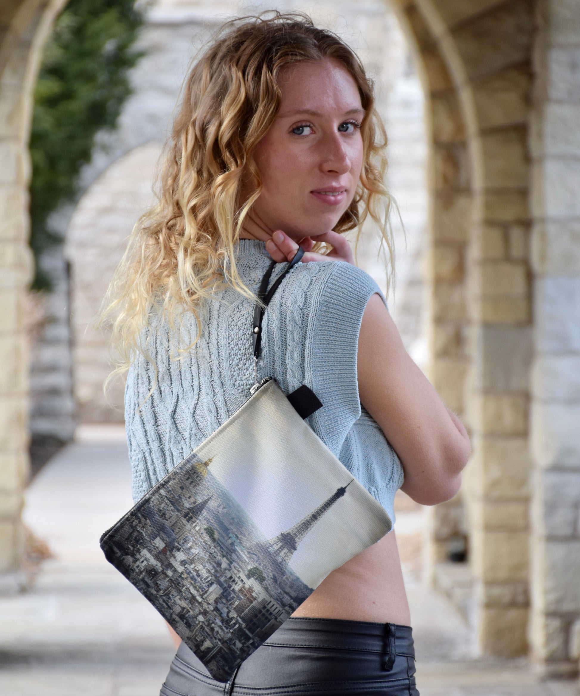 Be ready to travel with my Paris Wristlet Bag, featuring a ArtOnAJourney image of the beloved Eiffel Tower. A perfect size to pack light, daily essentials, and have a statement piece to hang from your wrist! Throw your essentials in your Paris Wristlet Bag and off you go!