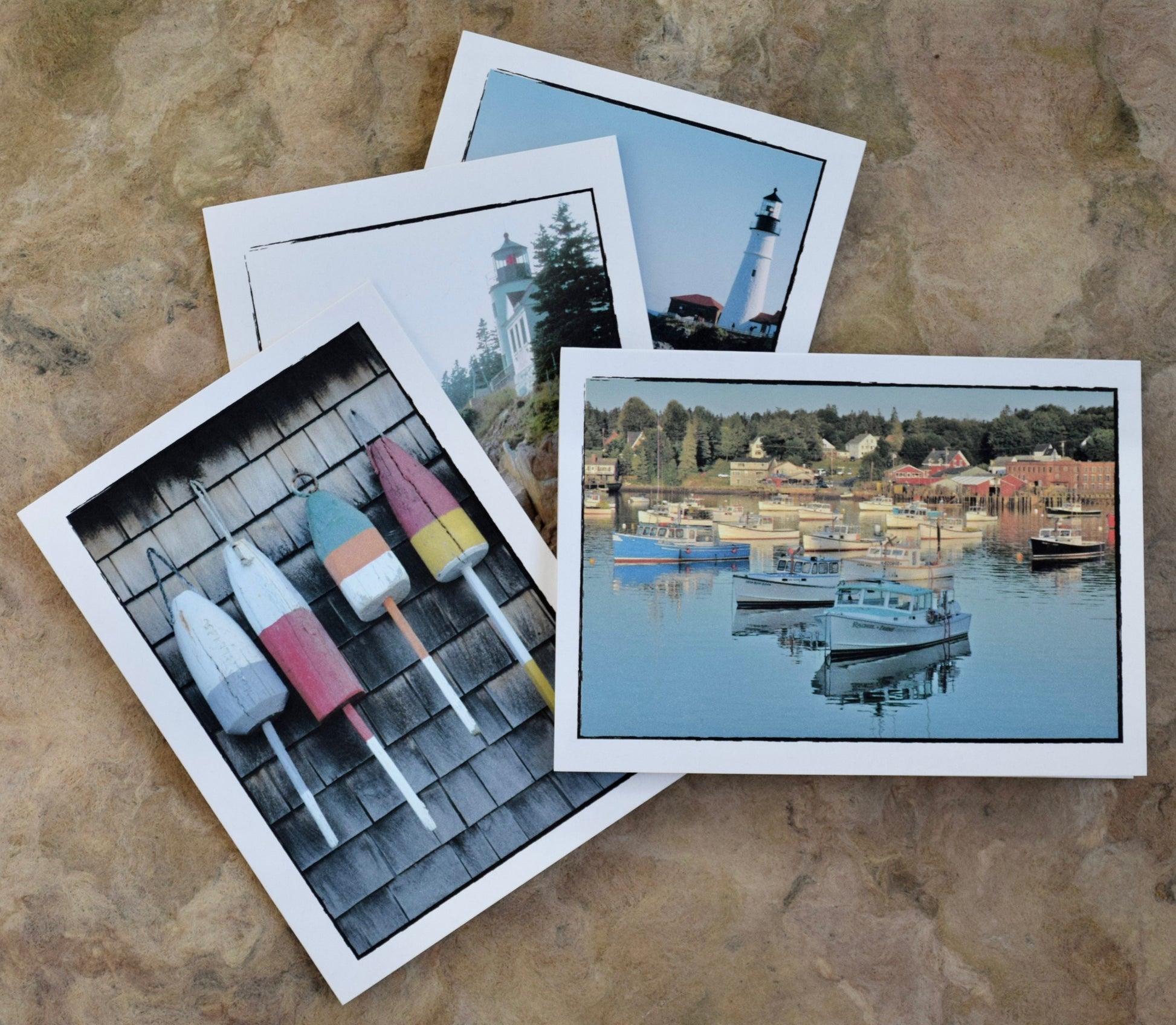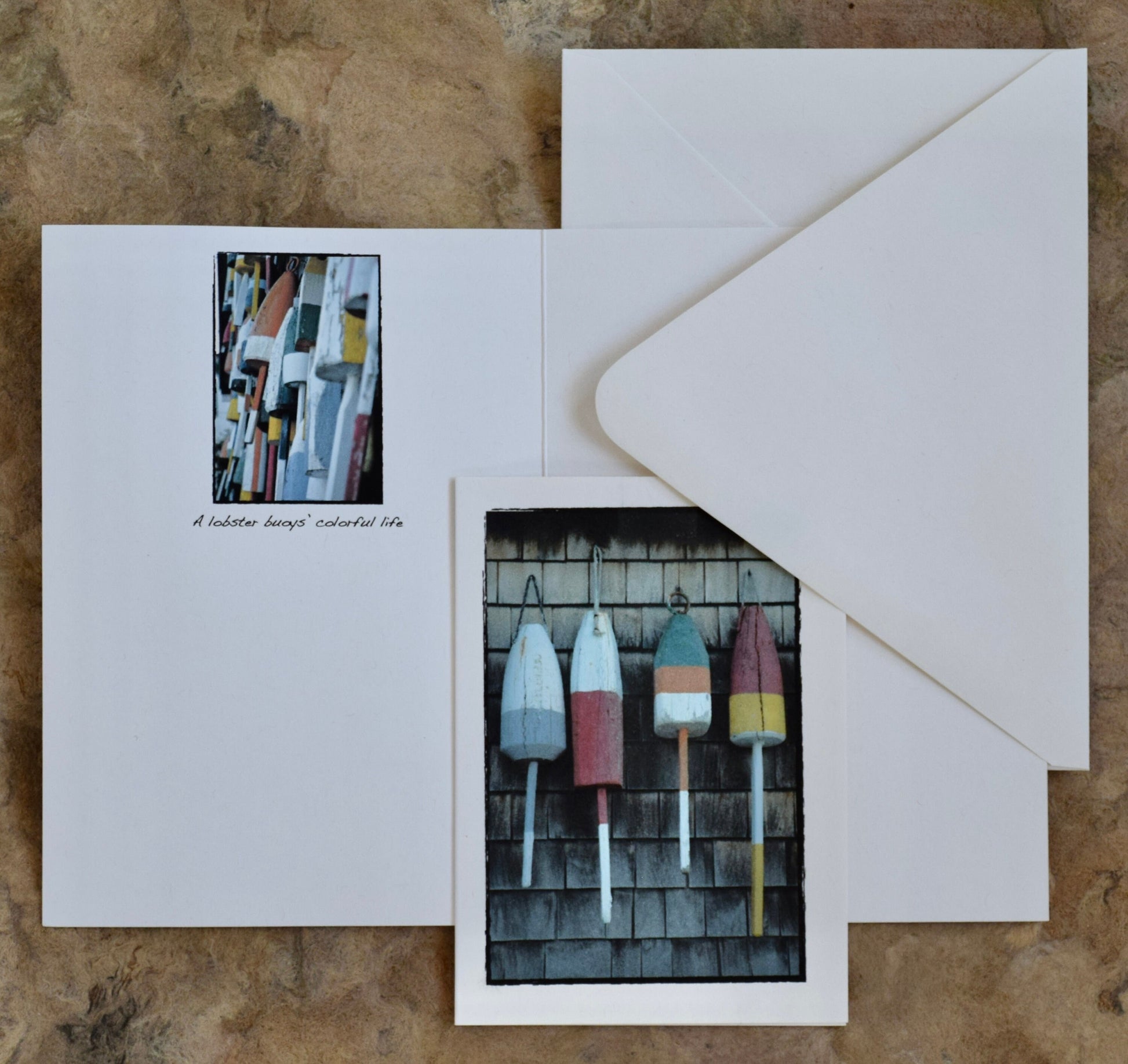 Maine Cards inspired by breathing in the sea air. All available in Greeting Card and Note Card sizes. Enjoy what Coastal Maine has to offer, including; historical lighthouses, lobster buoys in infinite color combinations, and a quintessential Maine harbor.