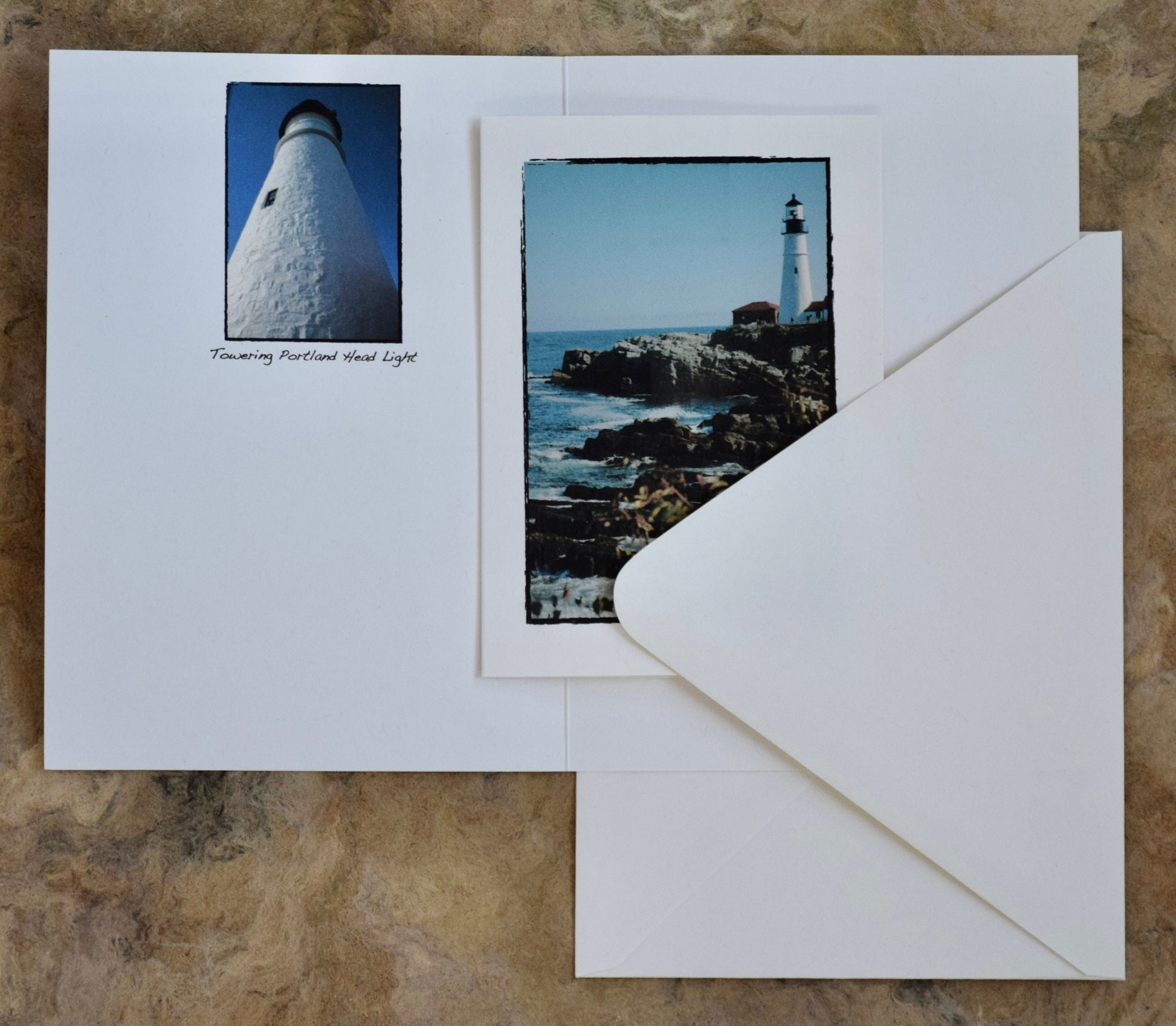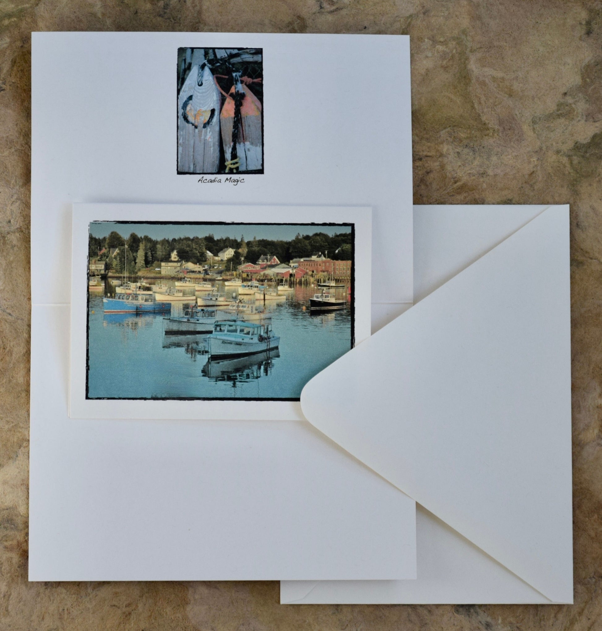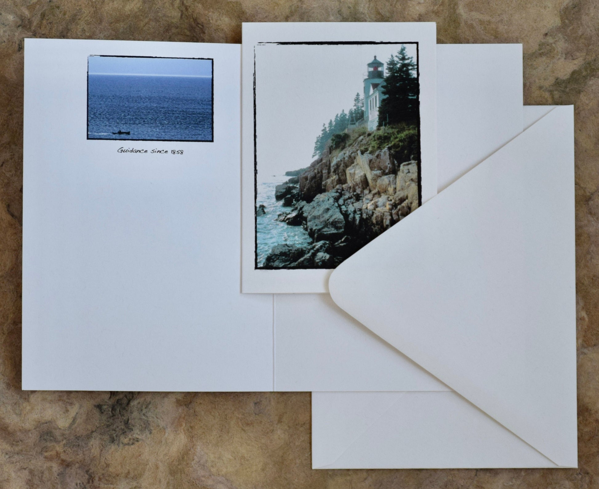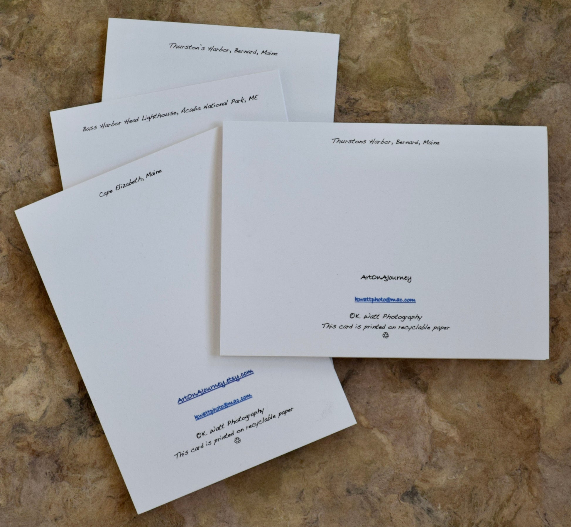 • Unique to my Maine Cards are that I also have a small inset photograph that corresponds to the cover shot, with a short phrase or inspiring word. The rest is blank with plenty of space for your correspondence.