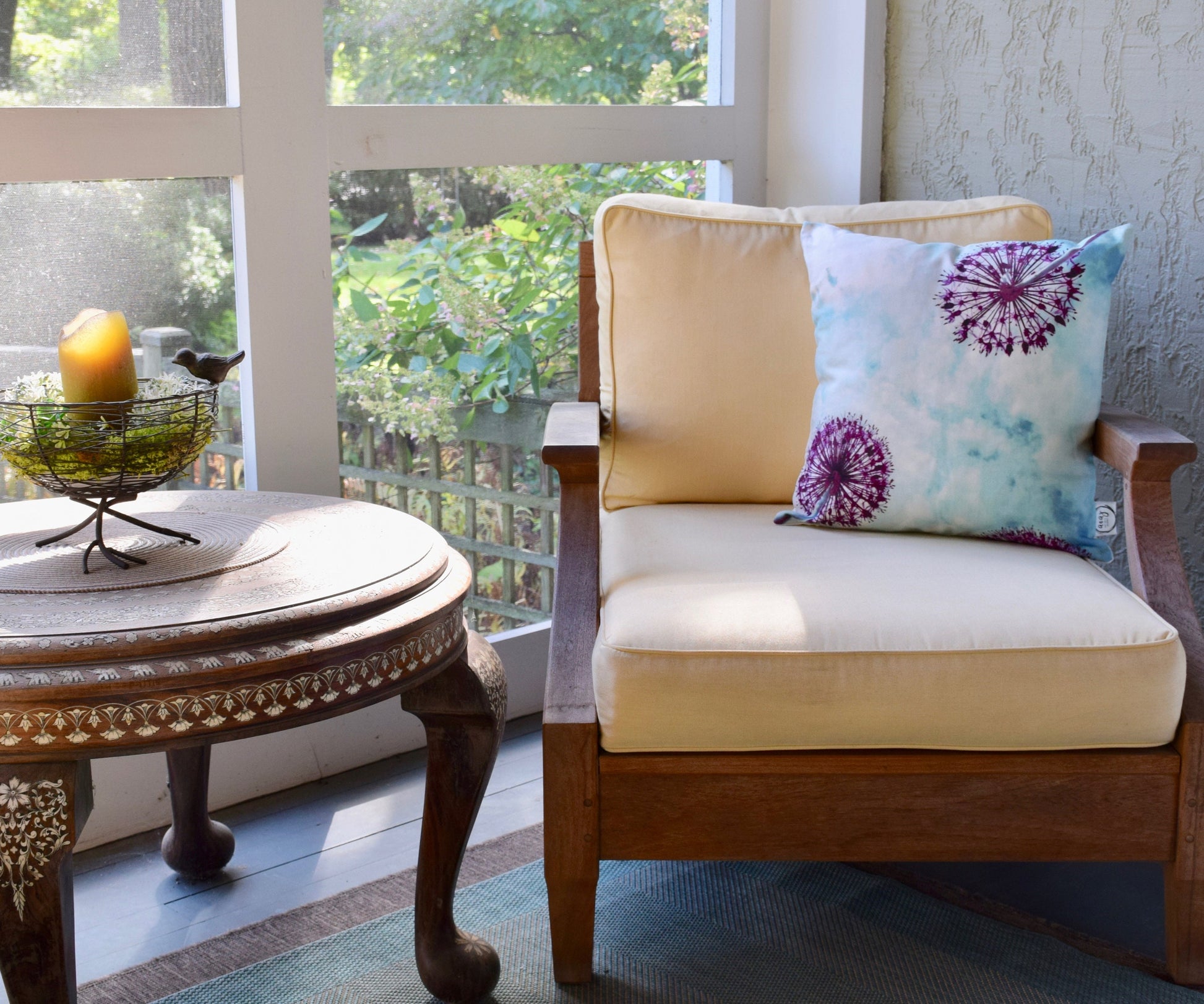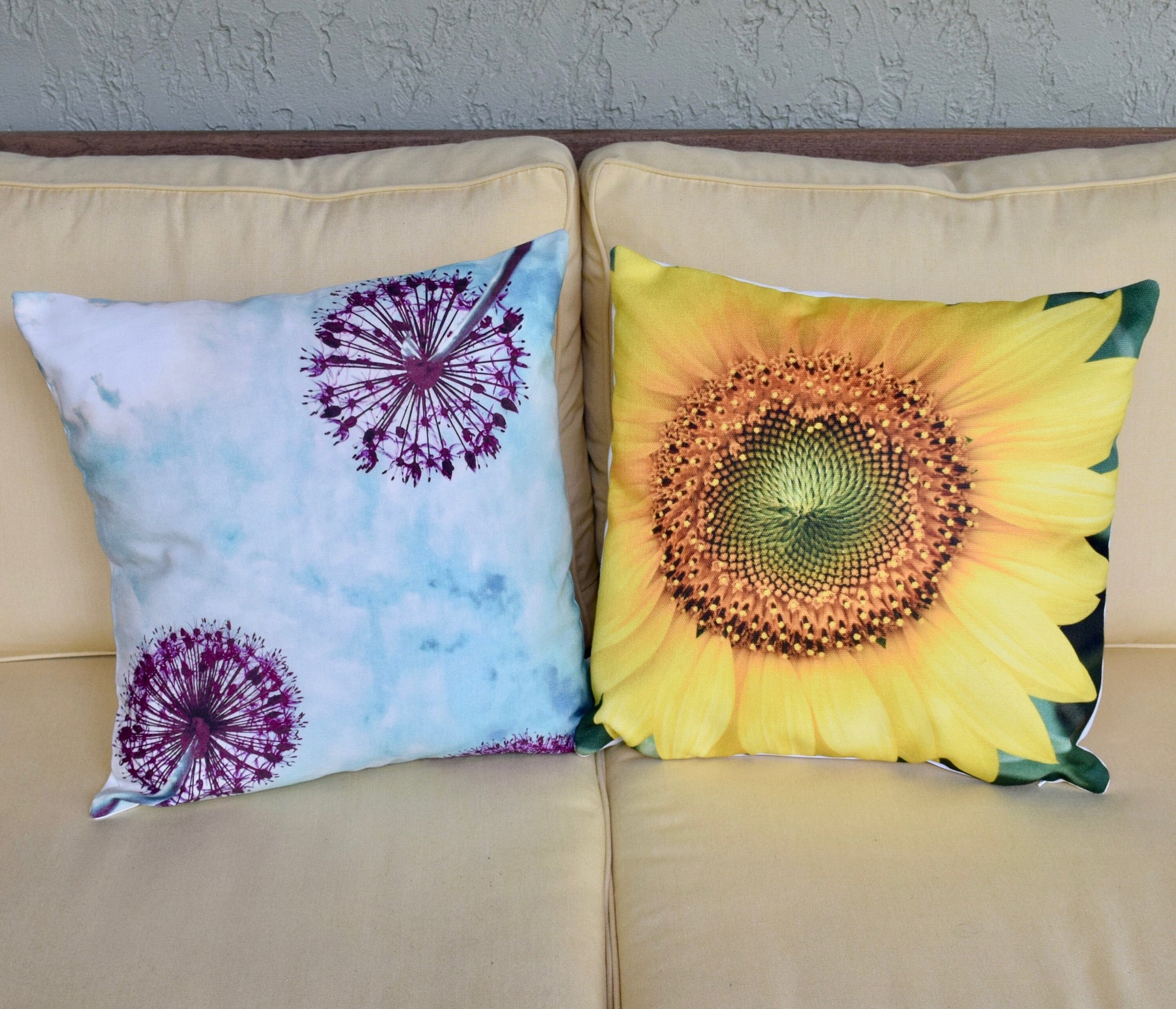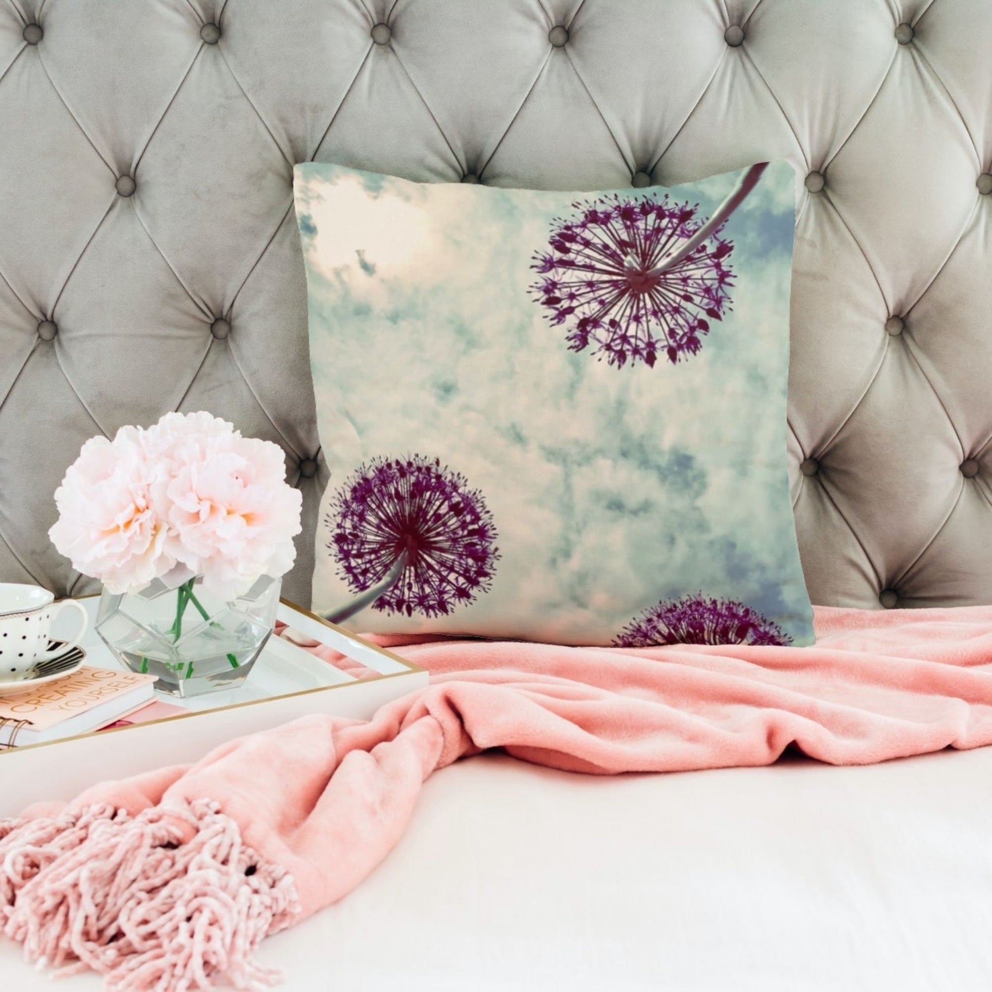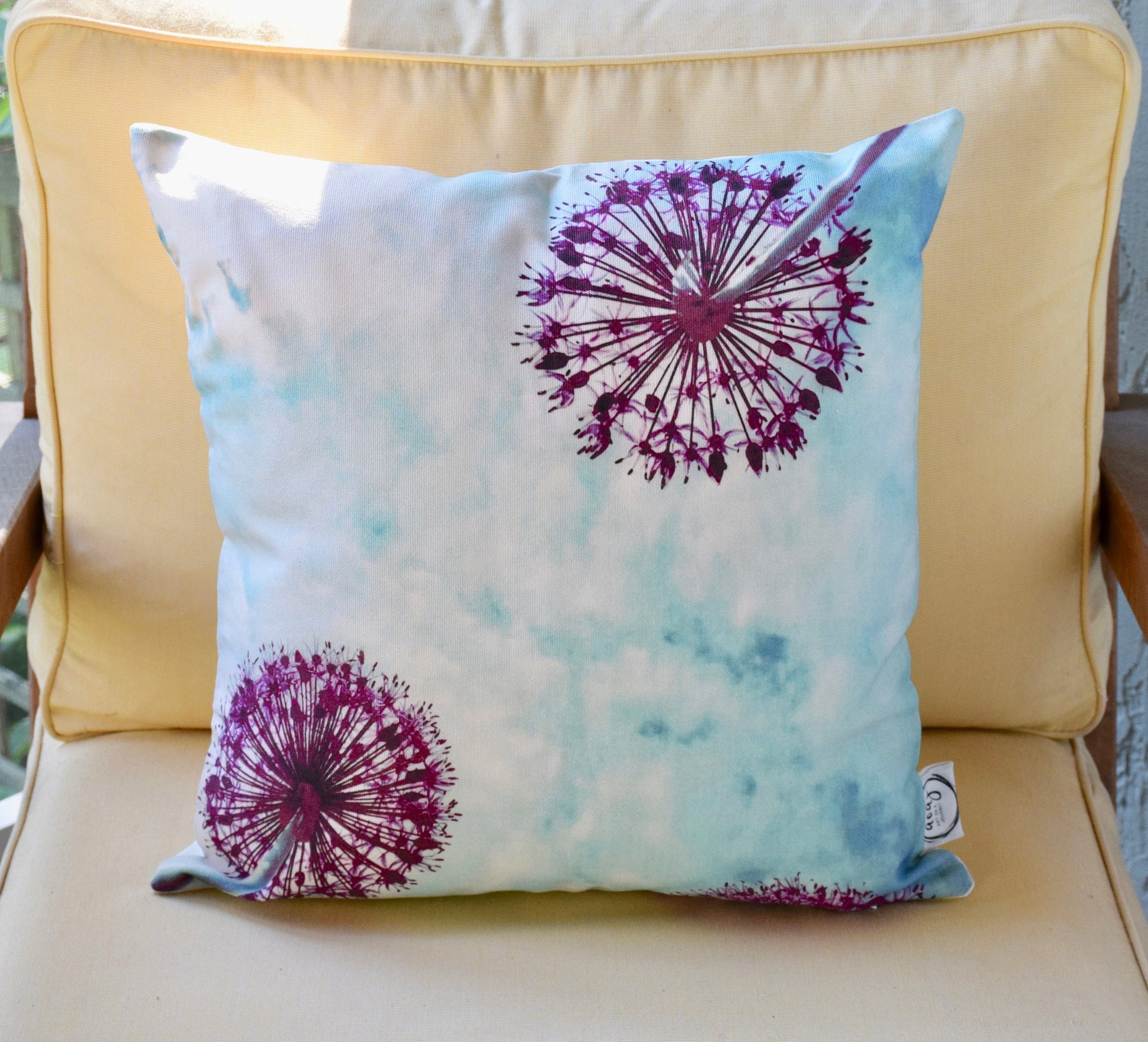Spring Decor has sprung with my Spring Pillow, featuring a ArtOnAJourney photograph of Purple Allium flowers, available as Pillow Cover Only. Beautiful, blue sky with fluffy, white clouds, are the background for these towering, Purple Alliums. Photographed from a low vantage point to enhance their towering effect as they reach for the sky!