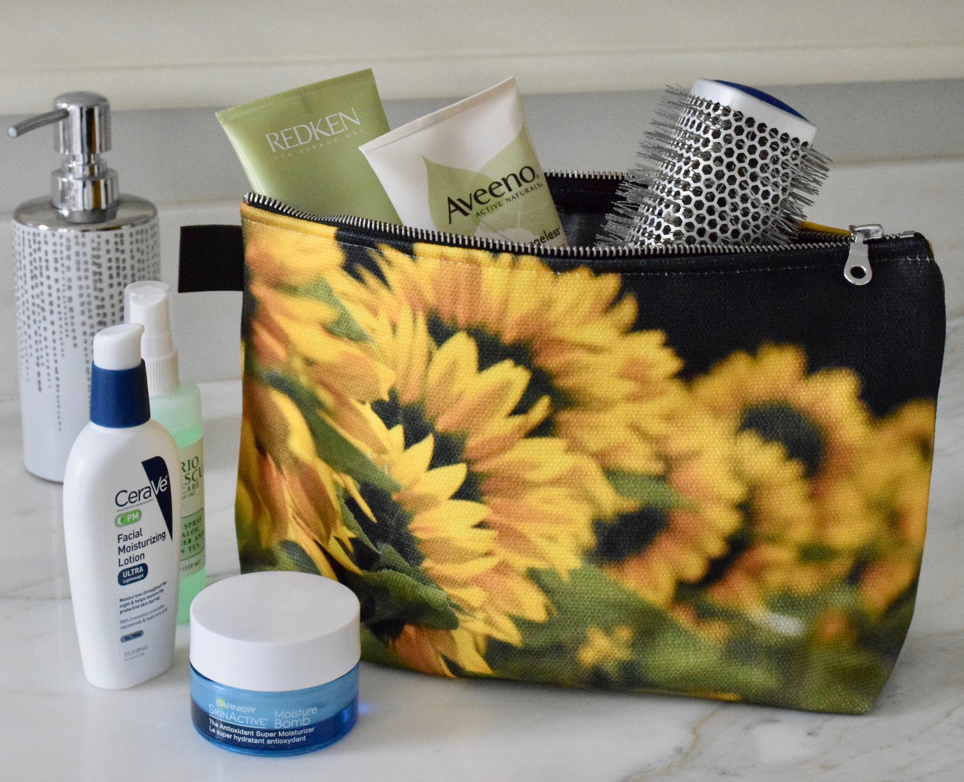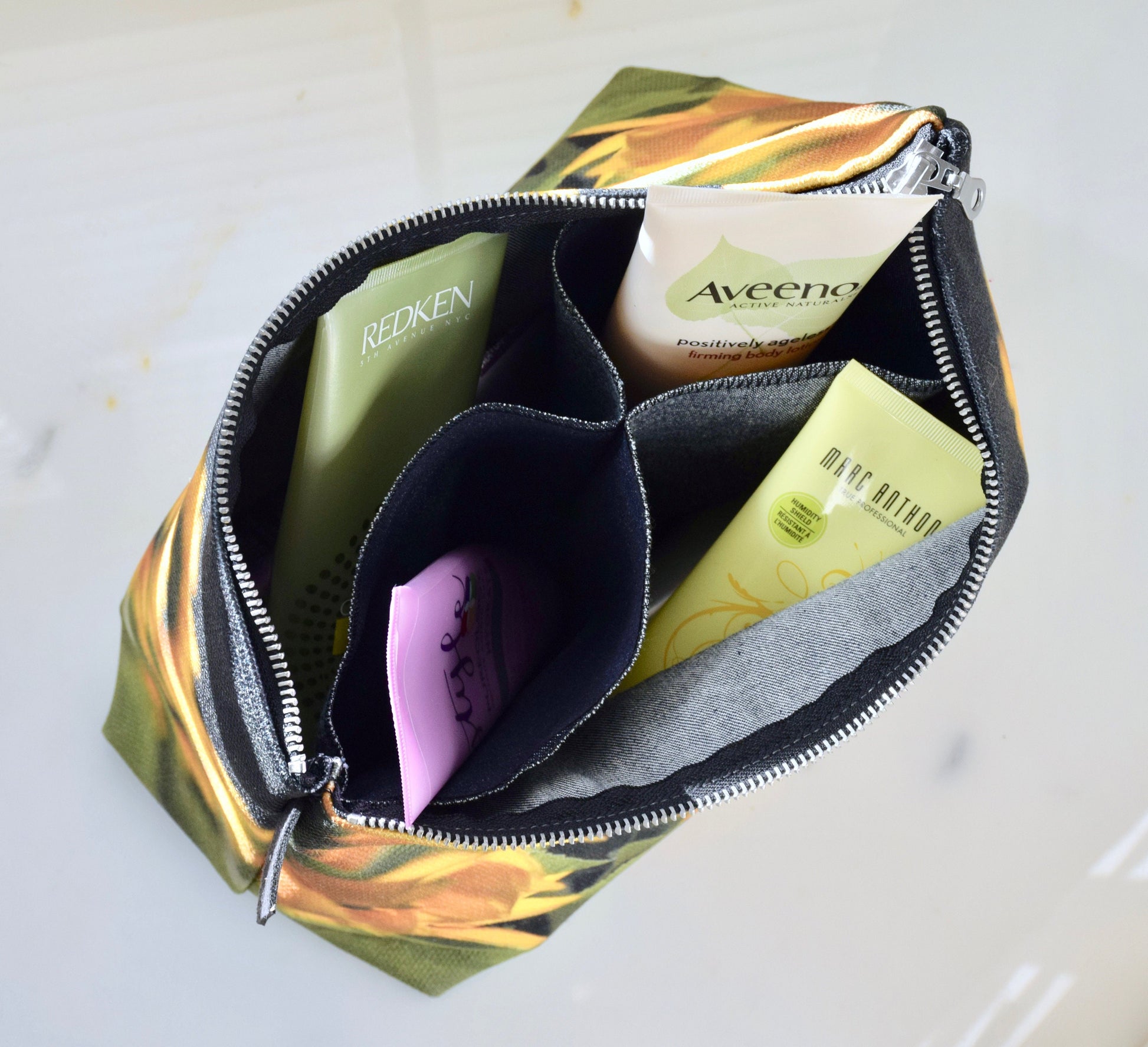• This Sunflower Makeup Bag has a generous gusset so it sits nicely on the counter (dimensions below).