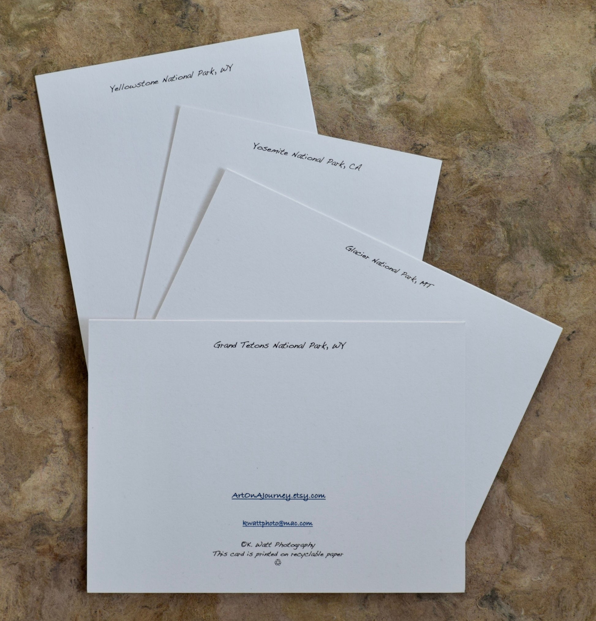 Get in touch with nature through my National Parks Card series. Available in Greeting Card and Note Card sizes. My handmade, National Park Cards, offer a glimpse into 4 stunning parks, which includes; Grand Tetons, Yellowstone, Glacier and Yosemite.